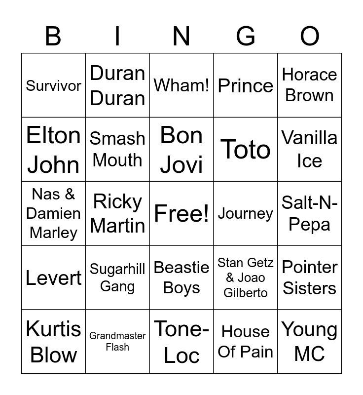 This bingo card has a free space and 29 words: Kurtis Blow, Spice Girls, Ricky Martin, Britney Spears, Survivor, Wham!, Smash Mouth, Sugarhill Gang, Journey, Grandmaster Flash, Salt-N-Pepa, Young MC, Tone-Loc, House Of Pain, Vanilla Ice, MC Hammer, Beastie Boys, Levert, Horace Brown, Nas & Damien Marley, Stan Getz & Joao Gilberto, Aha, Toto, Elton John, Prince, Duran Duran, Pointer Sisters, Bon Jovi and Billy Joel.