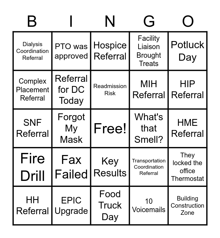 This bingo card has a free space and 29 words: HH Referral, Played a Prank on my Mission Partner, Forgot My Mask, Rehab Referral, Dialysis Coordination Referral, Hospice Referral, Referral for DC Today, Fax Failed, What's that Smell?, EPIC Upgrade, HME Referral, Building Construction Zone, Food Truck Day, 10 Voicemails, HIP Referral, Can't Find My Pen, Key Results, Fire Drill, Potluck Day, SNF Referral, Transportation Coordination Referral, LTACH Referral, MIH Referral, Complex Placement Referral, Facility Liaison Brought Treats, PTO was approved, They locked the office Thermostat, Readmission Risk and Length of Stay.