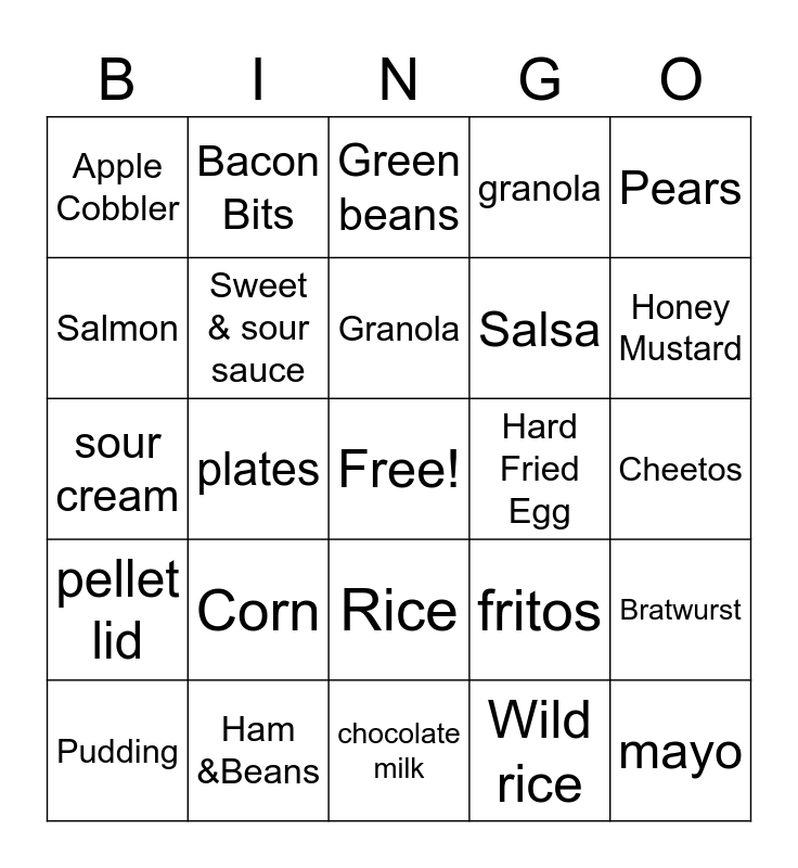 This bingo card has a free space and 24 words: Corn, Ham &Beans, Granola, Pudding, Pears, Apple Cobbler, Salmon, Bacon Bits, Hard Fried Egg, Rice, Salsa, sour cream, fritos, Bratwurst, Sweet & sour sauce, Wild rice, Cheetos, Green beans, Honey Mustard, plates, mayo, pellet lid, granola and chocolate milk.