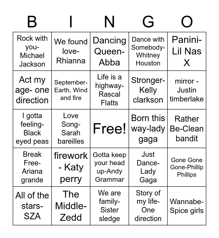 This bingo card has a free space and 24 words: firework - Katy perry, The Middle-Zedd, Life is a highway-Rascal Flatts, All of the stars-SZA, Panini-Lil Nas X, Rock with you-Michael Jackson, Act my age- one direction, We found love-Rhianna, Born this way-lady gaga, Gotta keep your head up-Andy Grammar, Stronger- Kelly clarkson, I gotta feeling- Black eyed peas, Just Dance-Lady Gaga, Gone Gone Gone-Phillip Phillips, September- Earth, Wind and fire, Story of my life- One direction, Rather Be-Clean bandit, Dancing Queen-Abba, mirror - Justin timberlake, Love Song- Sarah bareilles, Wannabe-Spice girls, Break Free- Ariana grande, Dance with Somebody-Whitney Houston and We are family- Sister sledge.