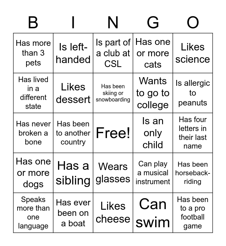 This bingo card has a free space and 24 words: Has a sibling, Has ever been on a boat, Has been skiing or snowboarding, Speaks more than one language, Likes science, Has more than 3 pets, Has lived in a different state, Is left-handed, Is an only child, Wears glasses, Wants to go to college, Has never broken a bone, Can play a musical instrument, Has been horseback-riding, Likes dessert, Can swim, Has four letters in their last name, Is part of a club at CSL, Is allergic to peanuts, Has been to another country, Has been to a pro football game, Has one or more dogs, Has one or more cats and Likes cheese.