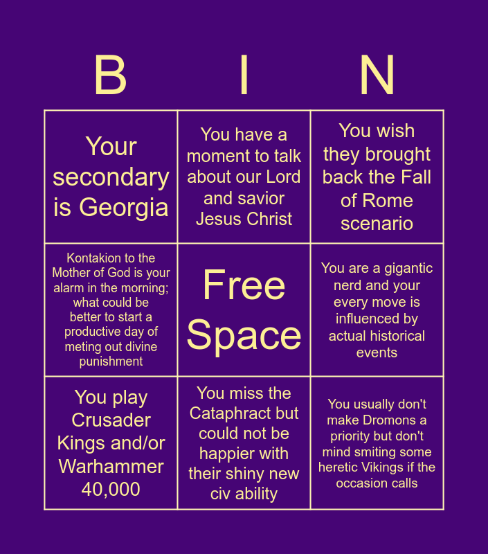 This bingo card has a free space and 8 words: You are a gigantic nerd and your every move is influenced by actual historical events, You wish they brought back the Fall of Rome scenario, You have a moment to talk about our Lord and savior Jesus Christ, You play Crusader Kings and/or Warhammer 40,000, Your secondary is Georgia, You usually don't make Dromons a priority but don't mind smiting some heretic Vikings if the occasion calls, Kontakion to the Mother of God is your alarm in the morning; what could be better to start a productive day of meting out divine punishment and You miss the Cataphract but could not be happier with their shiny new civ ability.