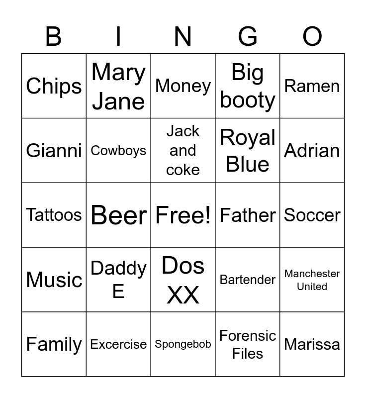 This bingo card has a free space and 24 words: Daddy E, Excercise, Jack and coke, Family, Ramen, Chips, Gianni, Mary Jane, Father, Dos XX, Royal Blue, Tattoos, Bartender, Manchester United, Cowboys, Forensic Files, Soccer, Money, Adrian, Beer, Marissa, Music, Big booty and Spongebob.