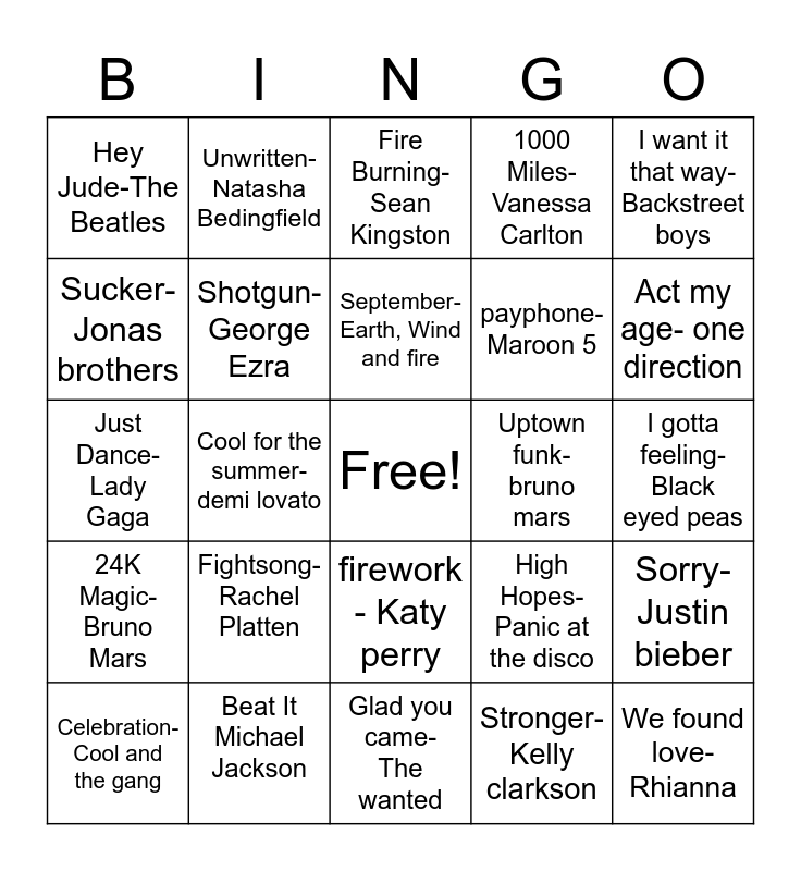This bingo card has a free space and 24 words: Fightsong- Rachel Platten, Beat It Michael Jackson, September- Earth, Wind and fire, Celebration- Cool and the gang, I want it that way-Backstreet boys, Hey Jude-The Beatles, Sucker- Jonas brothers, Unwritten-Natasha Bedingfield, Uptown funk-bruno mars, firework - Katy perry, payphone-Maroon 5, Just Dance-Lady Gaga, High Hopes-Panic at the disco, Sorry- Justin bieber, Shotgun-George Ezra, Stronger- Kelly clarkson, I gotta feeling- Black eyed peas, Fire Burning- Sean Kingston, Act my age- one direction, Cool for the summer- demi lovato, We found love-Rhianna, 24K Magic- Bruno Mars, 1000 Miles- Vanessa Carlton and Glad you came- The wanted.