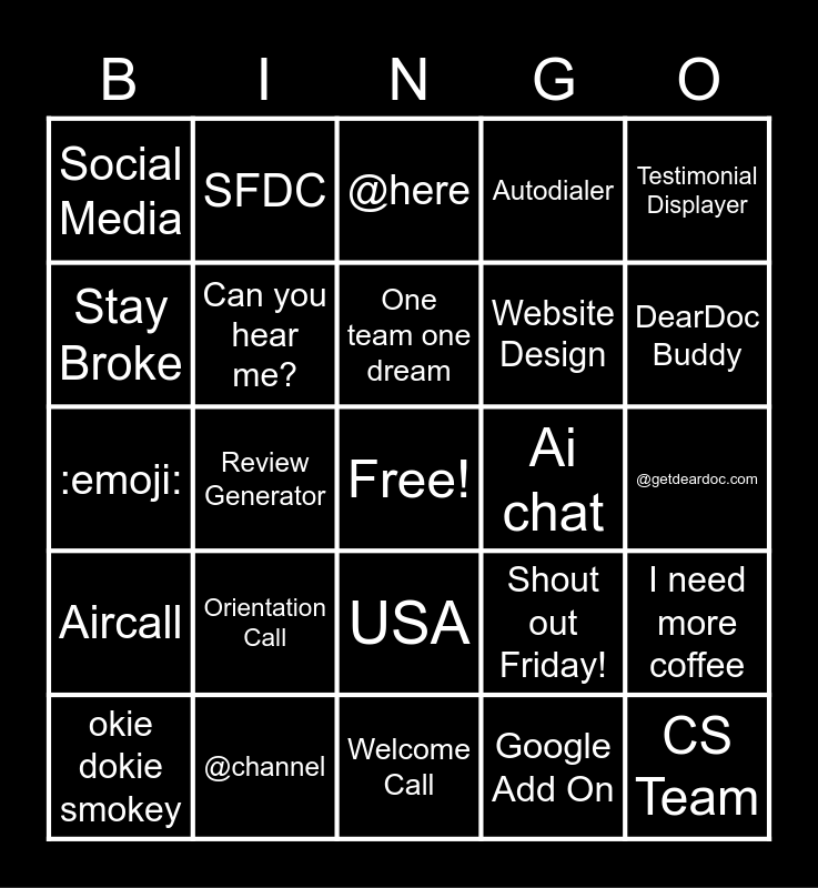 This bingo card has 1 images, a free space and 51 words: CS Team, Customer Obsessed, Welcome Call, Orientation Call, Slack, SFDC, Think Differently, Stay Broke, Zoom, Can you hear me?, My camera is not working today, I need more coffee, Shout out Friday!, Raise the roof!, LFGoooo, One team one dream, Ai chat, Dashboard, Testimonial Displayer, Review Generator, Google Add On, Social Media, Website Design, Seaniela, HIPAA, Renewals, New Hires, DearDoc Buddy, Telemedicine, Text To Pay, Autodialer, Work at Deardoc, Remote team, Penny Paloma, @here, @channel, /giphy, Fun Fact Friday, Success Call, Shadowing, @getdeardoc.com, Aircall, Coooliooooooooo, USA, Mex, PH, :emoji:, Awesome Sauce, Kahoot, okie dokie smokey and Awesome Stuff.