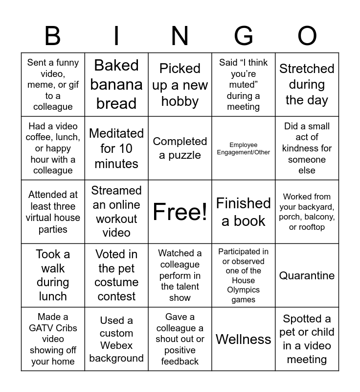 This bingo card has a free space and 32 words: Wellness, Ran a 5K, Streamed an online workout video, Walked 10K steps in a day, Took a walk during lunch, Meditated for 10 minutes, Stretched during the day, Quarantine, Baked banana bread, Wore pajamas all day, Completed a puzzle, Picked up a new hobby, Cooked a new recipe, Played a board game or card game, Finished a book, Fundraiser, Made a GATV Cribs video showing off your home, Attended at least three virtual house parties, Watched a colleague perform in the talent show, Voted in the pet costume contest, Participated in or observed one of the House Olympics games, WFH, Worked from your backyard, porch, balcony, or rooftop, Used a custom Webex background, Spotted a pet or child in a video meeting, Said “I think you’re muted” during a meeting, Employee Engagement/Other, Had a video coffee, lunch, or happy hour with a colleague, Sent a funny video, meme, or gif to a colleague, Gave a colleague a shout out or positive feedback, Voted in the 2020 U.S. Election and Did a small act of kindness for someone else.