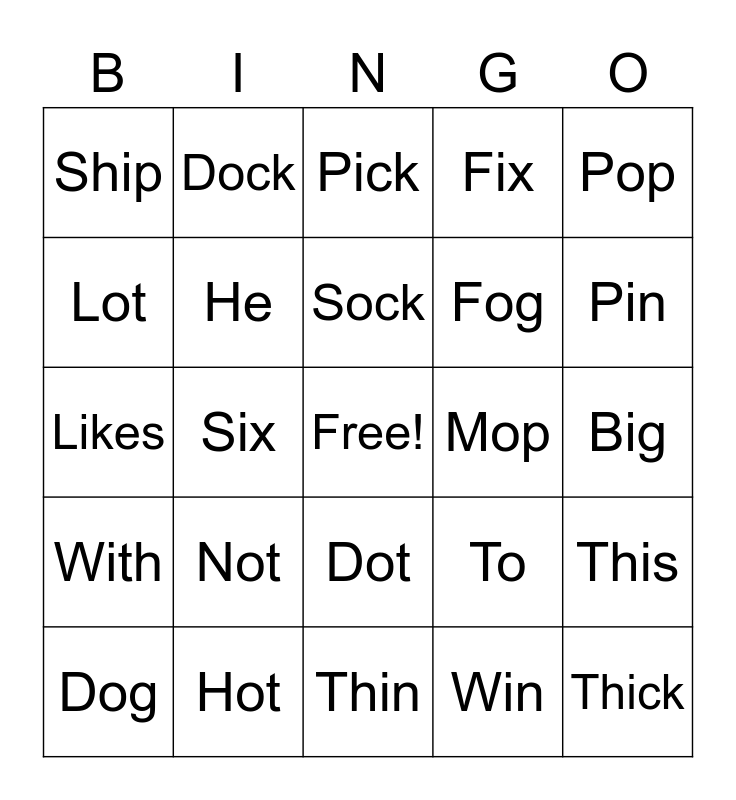 This bingo card has a free space and 24 words: Not, Hot, Sock, Dog, Pop, Ship, Lot, Dock, Mop, Dot, Fog, Likes, To, This, He, Win, Big, Pick, Pin, Six, Thick, With, Fix and Thin.