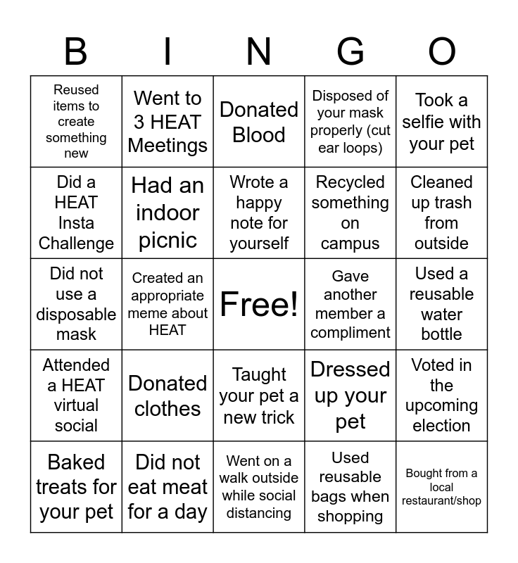 This bingo card has a free space and 28 words: Voted in the upcoming election, Created a Recycling system at home, Recycled something on campus, Used reusable bags when shopping, Did a HEAT Insta Challenge, Donated Blood, Went to 3 HEAT Meetings, Attended a HEAT virtual social, Gave another member a compliment, Baked treats for your pet, Did not use a disposable mask, Disposed of your mask properly (cut ear loops), Did not eat meat for a day, Went on a walk outside while social distancing, Cleaned up trash from outside, Donated human or animal food, Donated clothes, Had an indoor picnic, Wrote a happy note for yourself, Taught your pet a new trick, Reused items to create something new, Started a new Hobby, Bought from a local restaurant/shop, Created an appropriate meme about HEAT, Used a reusable water bottle, Dressed up your pet, Took a selfie with your pet and Attended a HEAT volunteer opportunity.