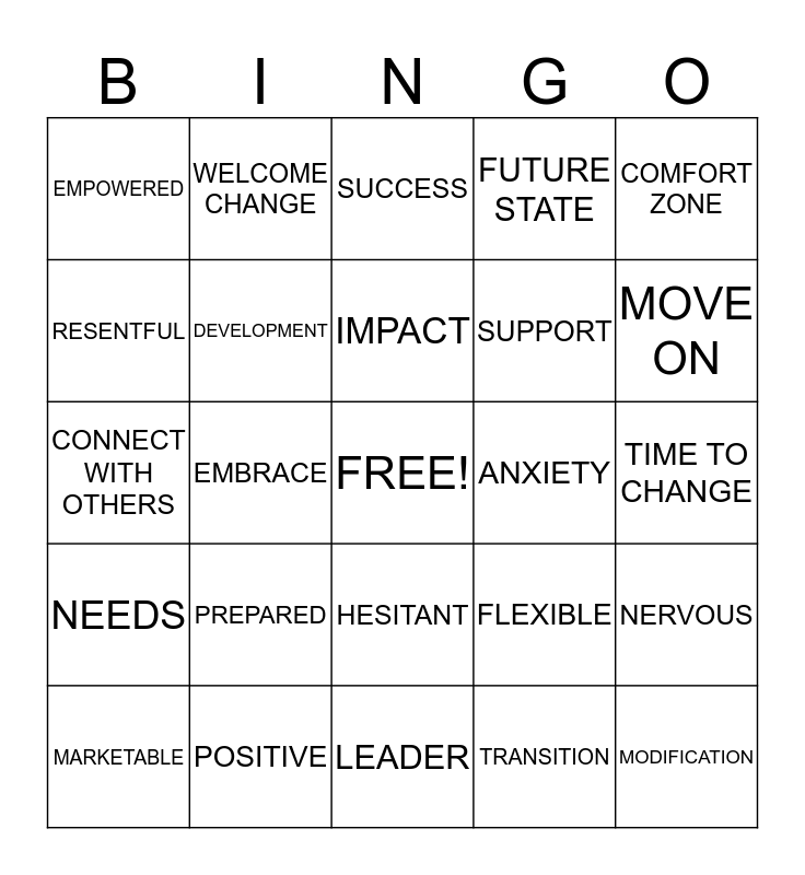 This bingo card has a free space and 24 words: PREPARED, POSITIVE, IMPACT, MARKETABLE, COMFORT ZONE, EMPOWERED, RESENTFUL, WELCOME CHANGE, ANXIETY, HESITANT, SUPPORT, CONNECT WITH OTHERS, FLEXIBLE, NERVOUS, DEVELOPMENT, TRANSITION, TIME TO CHANGE, SUCCESS, MOVE ON, EMBRACE, MODIFICATION, NEEDS, FUTURE STATE and LEADER.