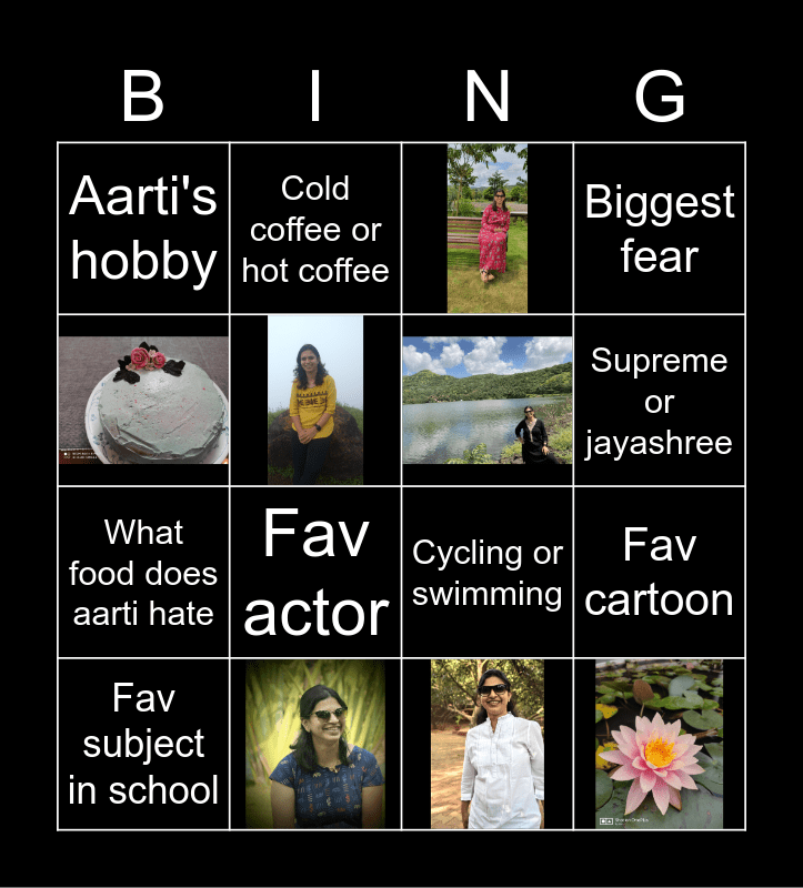 This bingo card has 7 images and 9 words: Fav cartoon, Aarti's hobby, What food does aarti hate, Cold coffee or hot coffee, Cycling or swimming, Fav subject in school, Biggest fear, Fav actor and Supreme or jayashree.
