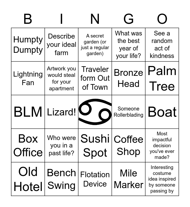 This bingo card has a free space and 24 words: Who were you in a past life?, Bench Swing, Traveler form Out of Town, Old Hotel, See a random act of kindness, Humpty Dumpty, Lightning Fan, Describe your ideal farm, Someone Rollerblading, Sushi Spot, Bronze Head, BLM, Coffee Shop, Most impactful decision you've ever made?, Artwork you would steal for your apartment, Mile Marker, Boat, A secret garden (or just a regular garden), Palm Tree, Lizard!, Interesting costume idea inspired by someone passing by, Box Office, What was the best year of your life? and Flotation Device.