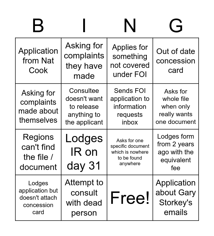 This bingo card has 17 words: Free!, Lodges application but doesn't attach concession card, Applies for something not covered under FOI, Application from Nat Cook, Lodges IR on day 31, Out of date concession card, Lodges form from 2 years ago with the equivalent fee, Sends FOI application to information requests inbox, Asks for whole file when only really wants one document, Consultee doesn't want to release anything to the applicant, Attempt to consult with dead person, Asks for one specific document which is nowhere to be found anywhere, Asking for complaints made about themselves, Asking for complaints they have made, Regions can't find the file / document, Wants info about a property that isn't one of ours and Application about Gary Storkey's emails.