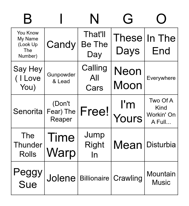 This bingo card has a free space and 51 words: All I Want To Do, Mountain Music, Boot Cottin' Boogie, Billionaire, Time Warp, Sold (The Grundy County Auctiion), Candy, Hey Mama, Say Hey ( I Love You), Can't Be Tamed, Gunpowder & Lead, These Days, Disturbia, Mean, Island In The Sun, Ocean Avenue, Calling All Cars, I'm Yours, New Shoes, In The End, (Don't Fear) The Reaper, Crawling, You Know My Name (Look Up The Number), Neon Moon, Green Onions, Caroline No, Everywhere, Glad All Over, Peggy Sue, That'll Be The Day, Heartbreak Hotel, Stuck On You, Good Luck Charm, Like The Rain, A Good Run Of Bad Luck, Jolene, Two Doors Down, Old Time Rock & Roll, Her Strut, Papa Loved Mama, Two Of A Kind Workin' On A Full..., The Thunder Rolls, Calling Baton Rouge, Calabria, Bra Off, Break My Heart, Senorita, The Bad Touch, Honky Tonk Badonkadonk, Jump Right In and Sexy Chick.