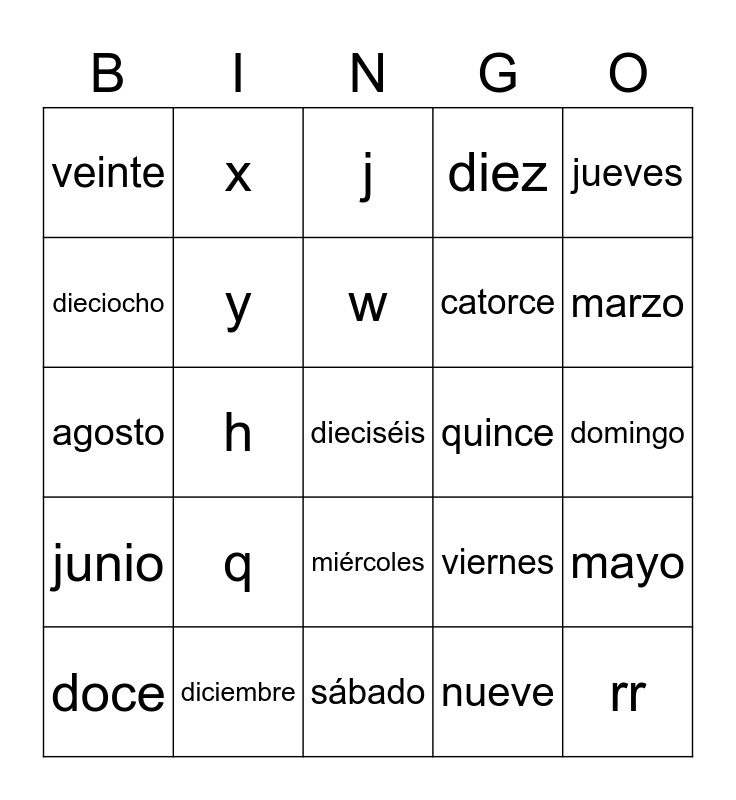 This bingo card has 30 words: diciembre, lunes, h, enero, veinte, j, y, miércoles, quince, sábado, domingo, dieciséis, nueve, rr, marzo, ll, viernes, junio, q, jueves, agosto, martes, x, catorce, dieciocho, diez, mayo, doce, w and abril.