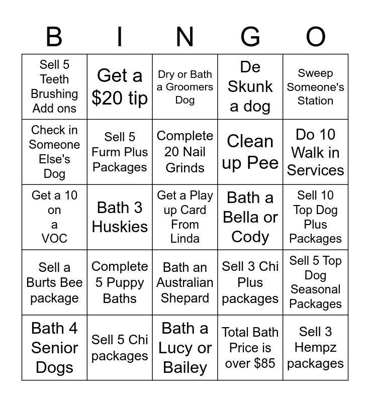 This bingo card has a free space and 24 words: Complete 5 Puppy Baths, Sell 5 Chi packages, Complete 20 Nail Grinds, Bath 4 Senior Dogs, Sweep Someone's Station, Sell 5 Teeth Brushing Add ons, Check in Someone Else's Dog, Get a $20 tip, Bath a Bella or Cody, Bath an Australian Shepard, Clean up Pee, Get a 10 on a VOC, Sell 3 Chi Plus packages, Sell 5 Top Dog Seasonal Packages, Sell 5 Furm Plus Packages, Total Bath Price is over $85, Sell 10 Top Dog Plus Packages, Dry or Bath a Groomers Dog, Do 10 Walk in Services, Bath 3 Huskies, Sell 3 Hempz packages, Sell a Burts Bee package, De Skunk a dog and Bath a Lucy or Bailey.