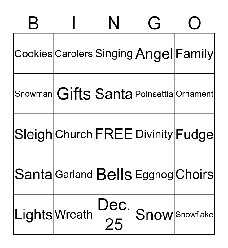 This bingo card has a free space and 24 words: Garland, Wreath, Santa, Lights, Family, Cookies, Snowman, Carolers, Divinity, Bells, Poinsettia, Sleigh, Eggnog, Choirs, Gifts, Snow, Fudge, Singing, Ornament, Church, Snowflake, Santa, Angel and Dec. 25.