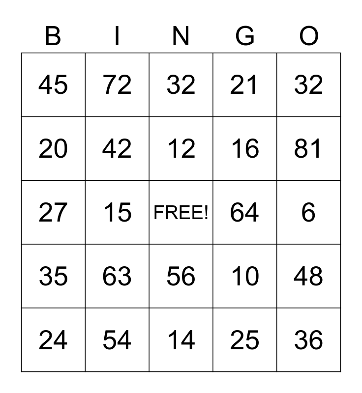 This bingo card has a free space and 24 words: 63, 54, 12, 24, 32, 45, 20, 72, 64, 56, 16, 27, 10, 48, 42, 25, 6, 32, 81, 15, 36, 35, 21 and 14.