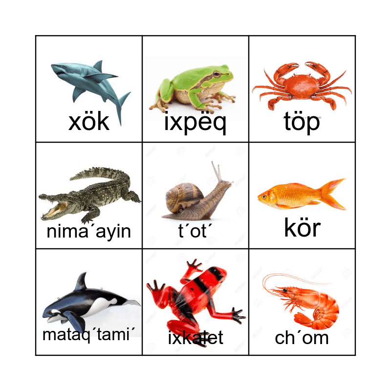 This bingo card has 8 images, a free space and 8 words: kör, töp, ixpëq, mataq´tami´, xök, ch´om, nima´ayin and ixkalet.