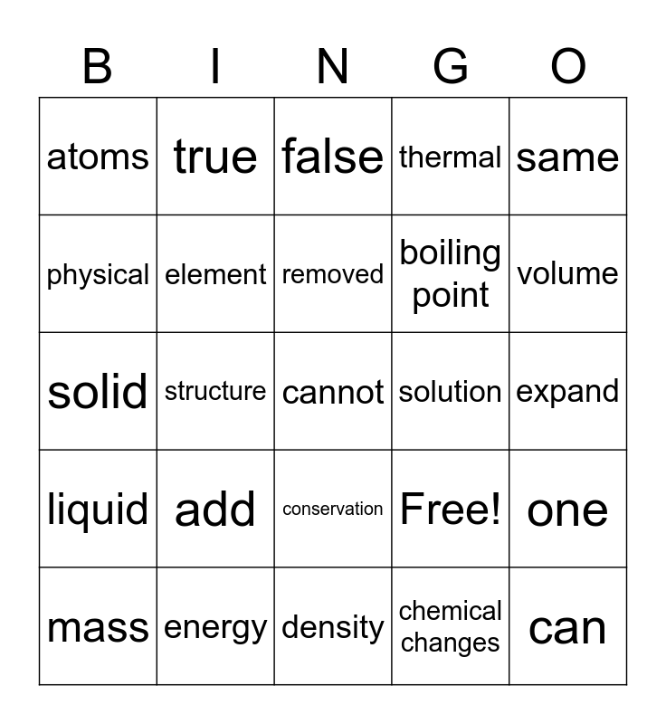 This bingo card has 25 words: add, density, removed, mass, same, atoms, physical, true, solution, conservation, boiling point, solid, Free!, one, element, can, expand, false, volume, structure, cannot, energy, liquid, thermal and chemical changes.