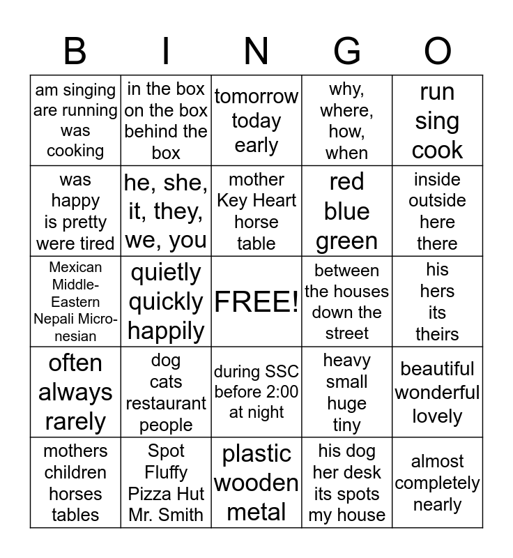 This bingo card has a free space and 24 words: dog cats restaurant people, Spot Fluffy Pizza Hut Mr. Smith, mother Key Heart horse table, mothers children horses tables, run sing cook, am singing are running was cooking, was happy is pretty were tired, in the box on the box behind the box, between the houses down the street, during SSC before 2:00 at night, red blue green, Mexican Middle- Eastern Nepali Micro-nesian, heavy small huge tiny, beautiful wonderful lovely, he, she, it, they, we, you, his dog her desk its spots my house, his hers its theirs, tomorrow today early, inside outside here there, quietly quickly happily, almost completely nearly, often always rarely, why, where, how, when and plastic wooden metal.