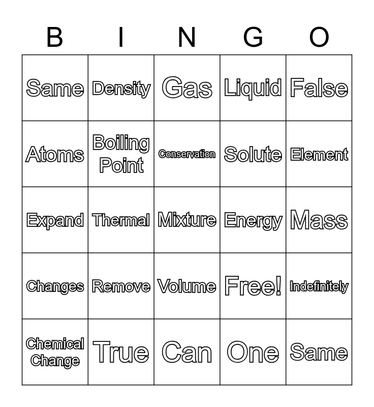 This bingo card has 25 words: Remove, Can, Conservation, Chemical Change, False, Same, Atoms, Density, Energy, Volume, Solute, Expand, Free!, Indefinitely, Boiling Point, Same, Mass, Gas, Element, Thermal, Mixture, True, Changes, Liquid and One.