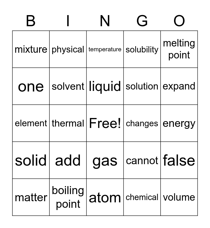 This bingo card has a free space and 24 words: add, boiling point, liquid, matter, melting point, mixture, one, physical, changes, gas, solution, element, cannot, false, solvent, chemical, energy, temperature, expand, thermal, volume, solid, solubility and atom.