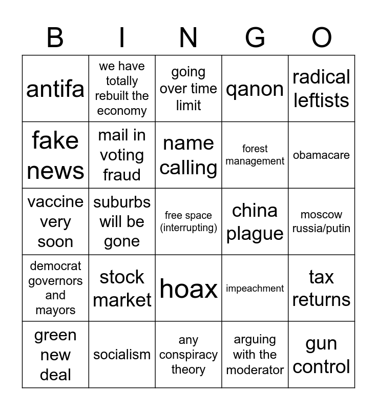 This bingo card has a free space and 24 words: stock market, socialism, name calling, green new deal, radical leftists, antifa, fake news, we have totally rebuilt the economy, china plague, hoax, forest management, vaccine very soon, impeachment, tax returns, mail in voting fraud, arguing with the moderator, moscow russia/putin, going over time limit, obamacare, suburbs will be gone, gun control, democrat governors and mayors, qanon and any conspiracy theory.