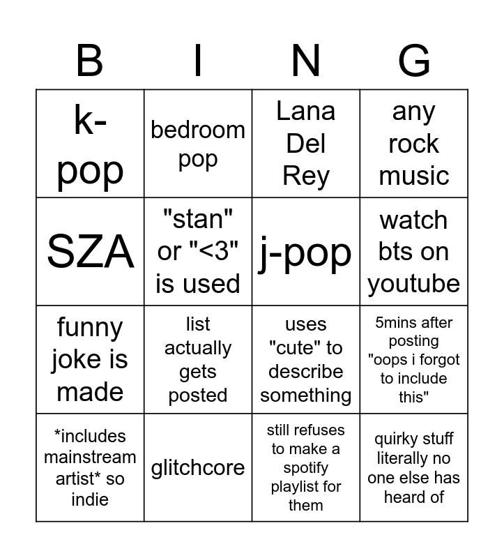 This bingo card has 16 words: glitchcore, 5mins after posting "oops i forgot to include this", Lana Del Rey, k-pop, funny joke is made, bedroom pop, uses "cute" to describe something, still refuses to make a spotify playlist for them, SZA, "stan" or "<3" is used, *includes mainstream artist* so indie, any rock music, list actually gets posted, watch bts on youtube, j-pop and quirky stuff literally no one else has heard of.
