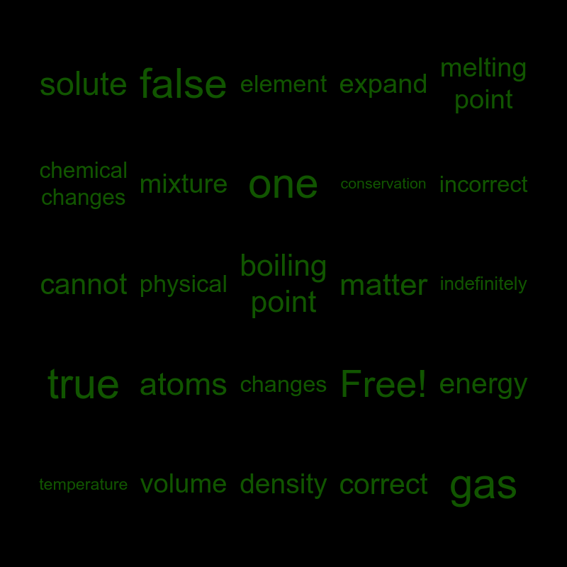 This bingo card has 25 words: atoms, density, one, temperature, melting point, solute, chemical changes, false, matter, changes, conservation, cannot, Free!, energy, mixture, gas, indefinitely, element, incorrect, physical, boiling point, volume, true, expand and correct.