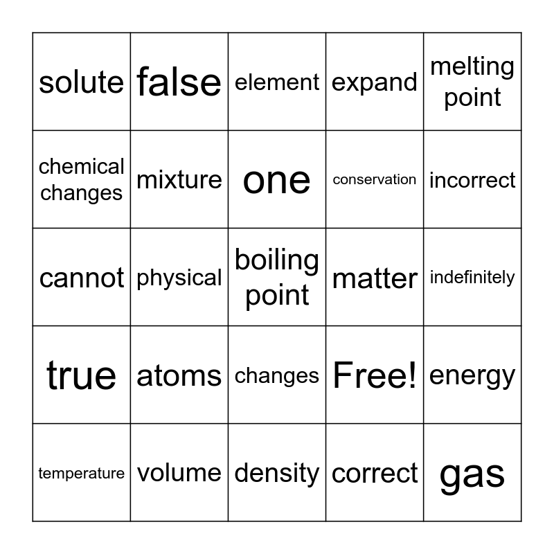 This bingo card has 25 words: atoms, density, one, temperature, melting point, solute, chemical changes, false, matter, changes, conservation, cannot, Free!, energy, mixture, gas, indefinitely, element, incorrect, physical, boiling point, volume, true, expand and correct.