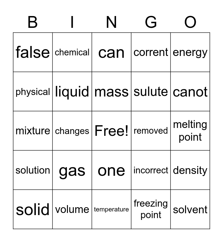 This bingo card has a free space and 24 words: gas, volume, mass, solid, energy, false, physical, chemical, removed, one, sulute, mixture, incorrect, density, liquid, freezing point, melting point, can, canot, changes, solvent, solution, corrent and temperature.