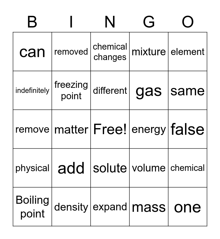 This bingo card has a free space and 24 words: add, density, different, Boiling point, element, can, indefinitely, removed, energy, solute, gas, remove, volume, chemical, freezing point, mass, false, chemical changes, same, matter, one, physical, mixture and expand.