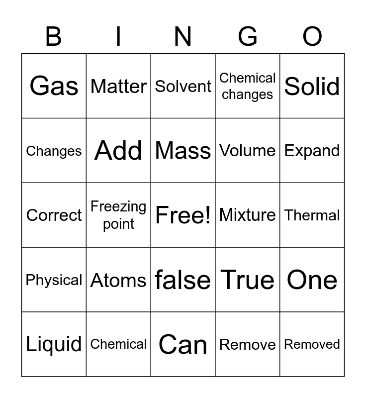 This bingo card has a free space and 24 words: Atoms, Chemical, Mass, Liquid, Solid, Gas, Changes, Matter, Mixture, false, Volume, Correct, True, One, Add, Remove, Thermal, Solvent, Expand, Freezing point, Removed, Physical, Chemical changes and Can.