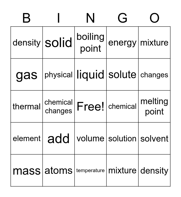 This bingo card has a free space and 24 words: add, atoms, liquid, mass, mixture, density, gas, solid, chemical, volume, solute, thermal, solution, solvent, physical, mixture, melting point, boiling point, changes, chemical changes, density, element, energy and temperature.