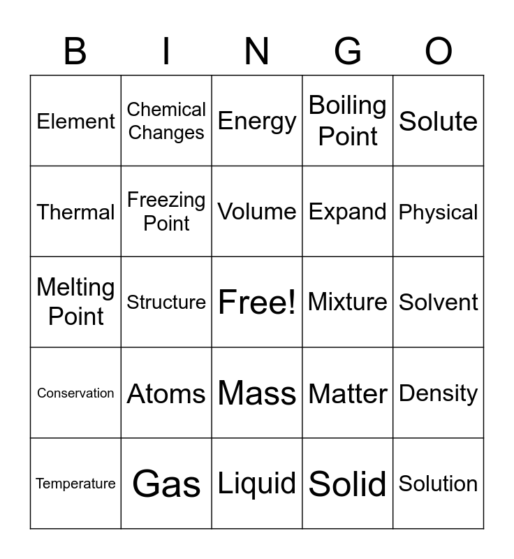 This bingo card has a free space and 24 words: Atoms, Gas, Volume, Temperature, Solute, Element, Thermal, Chemical Changes, Mixture, Mass, Expand, Melting Point, Matter, Density, Freezing Point, Solid, Solvent, Energy, Physical, Structure, Solution, Conservation, Boiling Point and Liquid.