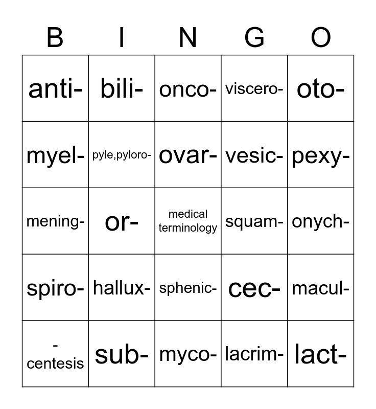 This bingo card has a free space and 25 words: hallux-, myco-, ovar-, -centesis, oto-, anti-, myel-, bili-, squam-, sphenic-, vesic-, mening-, cec-, macul-, pyle,pyloro-, thorac-, onych-, onco-, pexy-, or-, lact-, sub-, spiro-, viscero- and lacrim-.