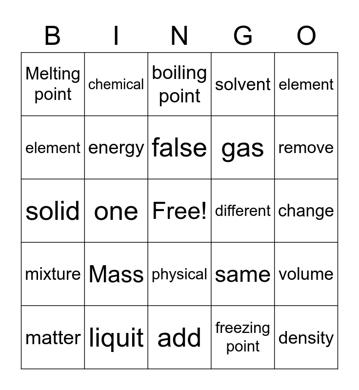 This bingo card has a free space and 24 words: Mass, liquit, false, matter, element, Melting point, element, chemical, different, physical, gas, solid, same, volume, energy, freezing point, change, boiling point, remove, one, density, mixture, solvent and add.