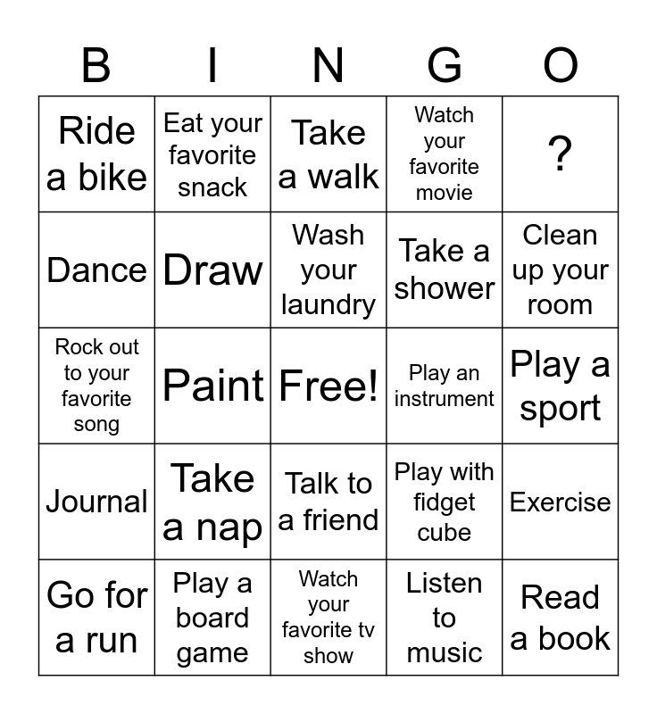 This bingo card has a free space and 24 words: Take a nap, Play a board game, Wash your laundry, Go for a run, ?, Ride a bike, Dance, Eat your favorite snack, Play an instrument, Talk to a friend, Take a shower, Rock out to your favorite song, Play with fidget cube, Exercise, Draw, Listen to music, Play a sport, Take a walk, Clean up your room, Paint, Read a book, Journal, Watch your favorite movie and Watch your favorite tv show.