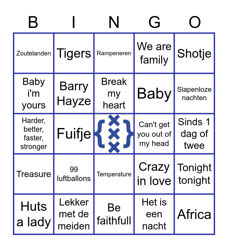 This bingo card has a free space and 47 words: Hans betaalt de schade, Africa, Jolene, Be faithfull, 99 luftballons, Boom boom pow, Tigers, Ice ice baby, Baby i'm yours, Watermelon sugar, Barry Hayze, We are family, Tonight tonight, Crazy in love, I'm gonna be (500 miles), Car wash, Break my heart, Can't get you out of my head, Jostiband intro, Shotje, Fuifje, Het is een nacht, Zoutelanden, Baby, Disco inferno, Slapenloze nachten, Huts a lady, Wap, Temperature, Treasure, 9 to 5, Uptown funk, Under presure, Come and get your love, Sterrenstof, Lekker met de meiden, Sinds 1 dag of twee, You don't know your beautifull, YMCA, Hij is van mij, Gimme gimme gimme, Rampeneren, Harder, better, faster, stronger, Wonderwall, Insane in the brain, Drank en drugs and All stars.