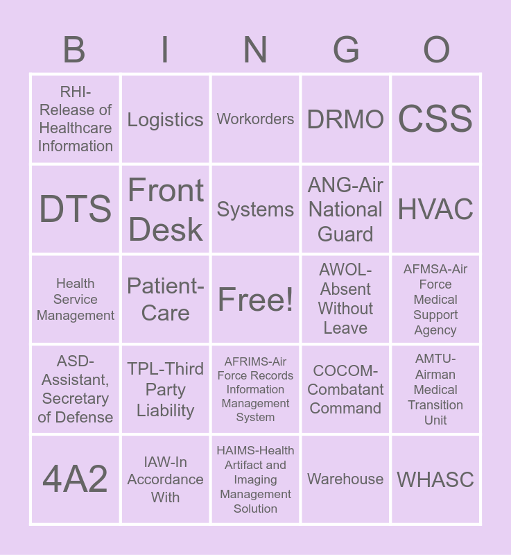 This bingo card has a free space and 74 words: MSC, COVID-19, Workorders, CHCS, AAAHC, 4A1, HIPAA, TOPA, 4A2, Materiel Specialist, Readiness, Mission-Essential, Systems, DTS, DMLSS, Patient-Care, 4A0, HVAC, BRAC, Health Service Management, Front Desk, Logistics, DRMO, Biomedical Equipment Maintenance, WHASC, AETC, 59 MDW, HAZMAT, TRICARE, AHLTA, CSS, PDG, WAPS, MTF, Medical Records, Warehouse, Medicine, APV-Ambulatory Procedure Visit, BHIE-Bidirectional Health Information Exchange, DCO-Defense Connect Online, HAIMS-Health Artifact and Imaging Management Solution, IAW-In Accordance With, IMC-Information Management Committee, JBSA-Joint Base San Antonio, OPR-Office of Primary Responsibility, RHI-Release of Healthcare Information, SECDES-SECAF Designee, TPL-Third Party Liability, ADAPT-Alcohol and Drug Abuse Prevention and Treatment, AFI-Air Force Instruction, AFMOA-Air Force Medical Operations Agency, AFMS-Air Force Medical Service, AFMSA-Air Force Medical Support Agency, AFOSI-Air Force Office of Special Investigation, AFR-Air Force Reserve, AFRC-Air Force Reserve Command, AFRIMS-Air Force Records Information Management System, AFSC-Air Force Specialty Code, AHLTA-Armed Forces Health Longitudinal Technology Application, AMTU-Airman Medical Transition Unit, ANG-Air National Guard, ARC-Air Reserve Component, ASD-Assistant, Secretary of Defense, ASIMS-Aerospace Services Information Management System, AWOL-Absent Without Leave, CED-Contingency, Exercise, Deployment, CHCS--Composite Healthcare System, CLIA-Clinical Laboratory Improvements Amendments, COCOM-Combatant Command, CONUS-Continental United States, DC-Dental Corps, DEERS-Defense Enrollment Eligibility Reporting System, DHA-Defense Health Agency and DoD-Department of Defense.