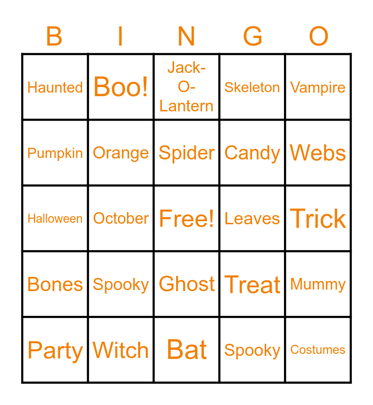 This bingo card has a free space and 26 words: Ghost, Spooky, Spider, Witch, Vampire, Haunted, Pumpkin, Boo!, Trick, Treat, Candy, Halloween, Mummy, Party, October, Mask, Skeleton, Bones, Jack-O-Lantern, Costumes, Webs, Bat, Leaves, Spooky, Orange and Apples.