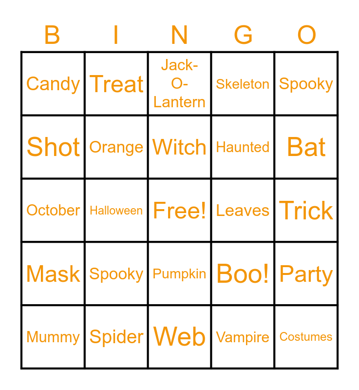 This bingo card has a free space and 26 words: Pumpkin, Vampire, Witch, Spider, Spooky, Candy, Shot, Treat, Trick, Boo!, Haunted, October, Party, Mummy, Halloween, Bones, Skeleton, Mask, Jack-O-Lantern, Costumes, Bat, Web, Leaves, Spooky, Orange and Apples.
