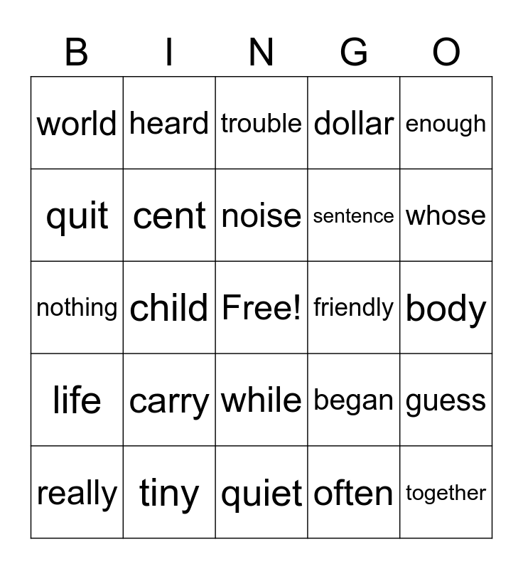 This bingo card has a free space and 24 words: carry, tiny, noise, really, enough, world, quit, heard, friendly, while, sentence, nothing, began, guess, cent, often, body, trouble, whose, child, together, life, dollar and quiet.