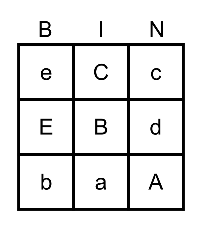 This bingo card has 11 words: A, a, B, b, C, c, d, D, E, e and free.