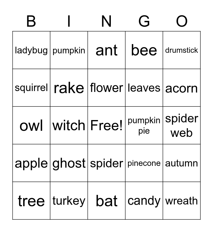 This bingo card has a free space and 26 words: spider, candy, flower, turkey, drumstick, ladybug, squirrel, pumpkin, spider web, pinecone, leaves, owl, autumn, tree, witch, corn, bee, apple, ant, wreath, acorn, bat, pumpkin pie, ghost, rake and trick or treat.
