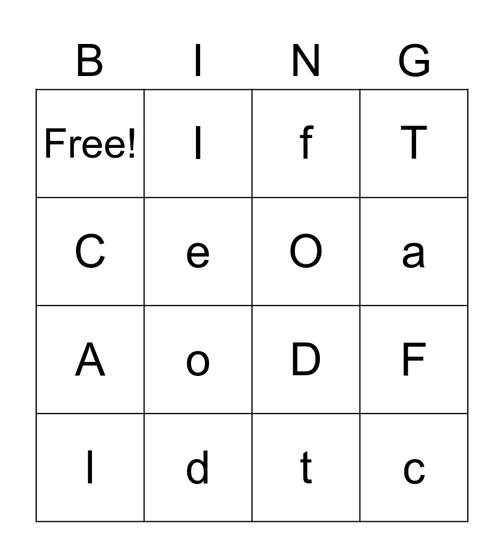 This bingo card has 19 words: l, L, f, F, i, I, t, T, Free!, o, O, a, A, d, D, c, C, e and E.