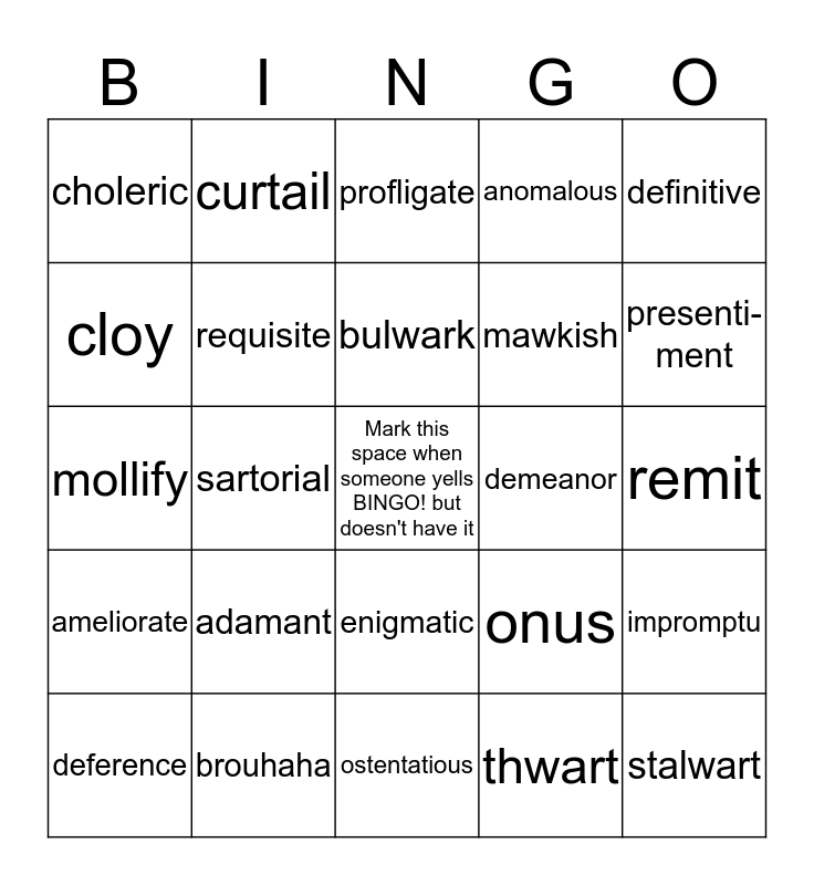 This bingo card has a free space and 24 words: adamant, brouhaha, bulwark, deference, definitive, choleric, cloy, curtail, demeanor, enigmatic, mawkish, mollify, onus, impromptu, requisite, thwart, remit, profligate, presenti-ment, sartorial, stalwart, ameliorate, anomalous and ostentatious.