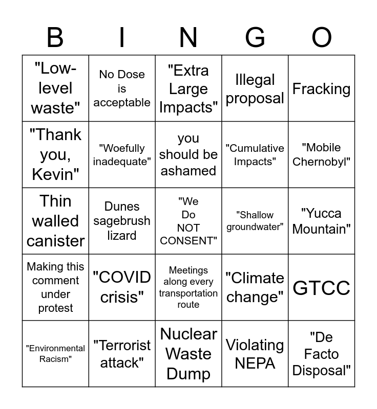 This bingo card has a free space and 29 words: "Environmental Racism", Pristine lands, Dunes sagebrush lizard, "Oglalla aquifer", "Low-level waste", "Extra Large Impacts", "Woefully inadequate", "COVID crisis", "Shallow groundwater", "Terrorist attack", "Yucca Mountain", "De Facto Disposal", Nuclear Waste Dump, Violating NEPA, "Mobile Chernobyl", "Nuclear Colonialism", Meetings along every transportation route, Making this comment under protest, Fracking, Thin walled canister, "Climate change", Train derailment, "Cumulative Impacts", "Thank you, Kevin", Illegal proposal, No Dose is acceptable, GTCC, you should be ashamed and Geologically unsuitable.