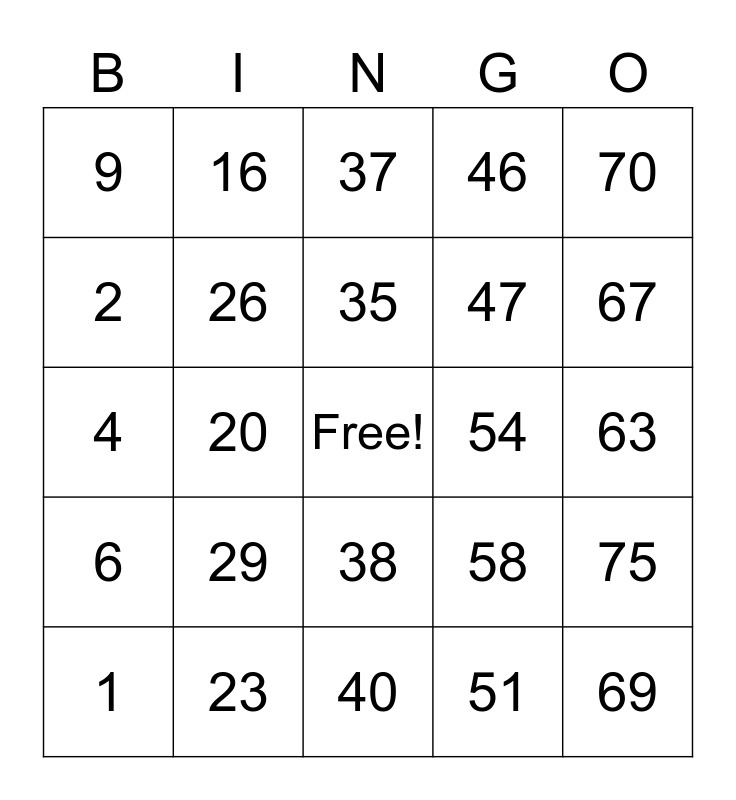 This bingo card has a free space and 24 words: 1, 29, 35, 51, 70, 9, 16, 37, 54, 63, 4, 26, 58, 75, 2, 23, 40, 46, 67, 6, 20, 38, 47 and 69.