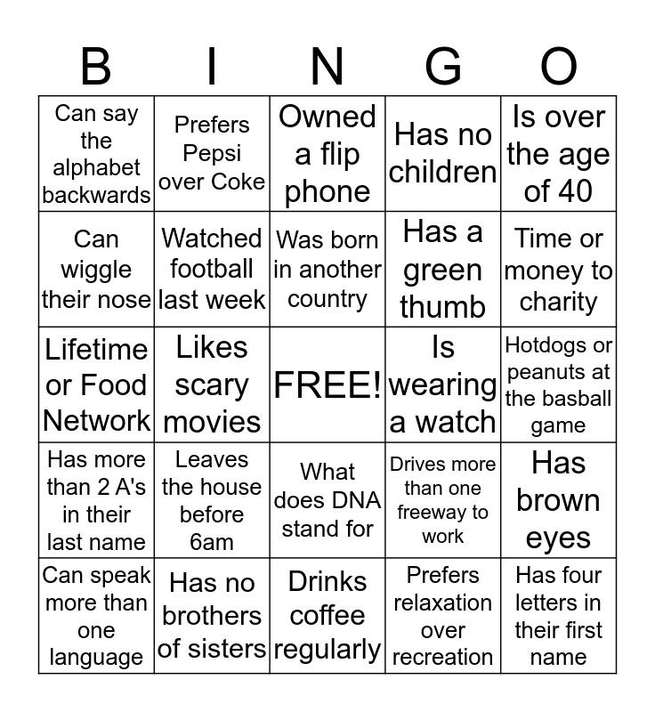 This bingo card has a free space and 24 words: Leaves the house before 6am, Has no brothers of sisters, Was born in another country, Can speak more than one language, Is over the age of 40, Can say the alphabet backwards, Can wiggle their nose, Prefers Pepsi over Coke, Is wearing a watch, What does DNA stand for, Has a green thumb, Lifetime or Food Network, Drives more than one freeway to work, Has brown eyes, Watched football last week, Prefers relaxation over recreation, Hotdogs or peanuts at the basball game, Owned a flip phone, Time or money to charity, Likes scary movies, Has four letters in their first name, Has more than 2 A's in their last name, Has no children and Drinks coffee regularly.